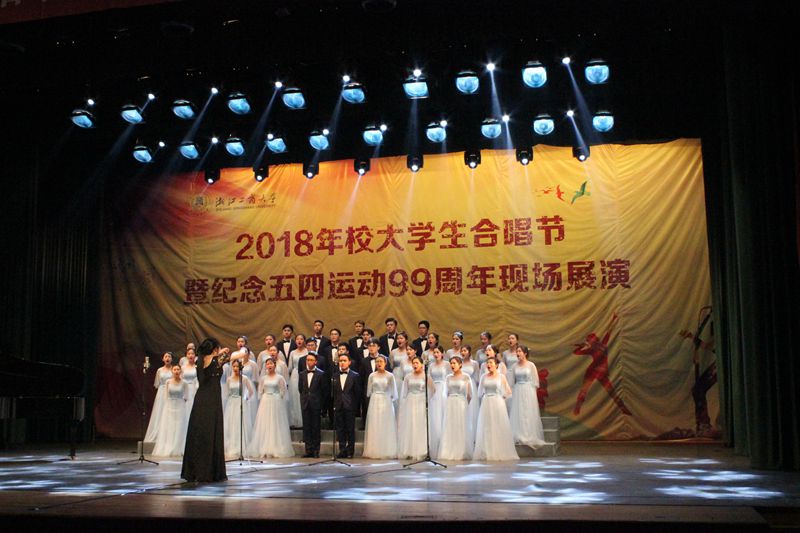 99年前,一群意气风发的青年用热血和生命谱写了一曲壮丽的青春之歌,绘就了一幅最宏伟的爱国雄图。而此刻,青年学子同样用美妙的歌声传递美好,传递力量。首先出场的是经济学院和外语学院的合唱团,一首《乘着歌声的翅膀》悠扬动听,将现场观众的爱国思绪缓缓拉长。旅游学院和公管学院带来的《红旗颂》、《闪亮的日子》句句饱含深情,合唱团成员身穿优雅庄重的礼服,在指挥人员的引导下用心歌唱。台下观众掌声连连,现场气氛热烈。
