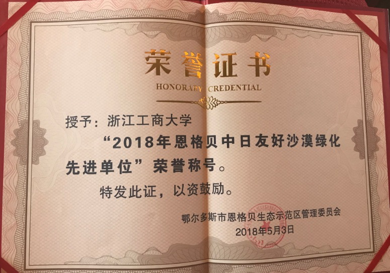 中日青年沙漠绿化活动由中日双方共同举办。旨在通过沙漠绿化活动改善地球环境,增进中日之间的理解和友谊。此项活动自2008年开始以来,已经历10个春秋。迄今为止,参加此项活动的志愿者已达2000多人,在多方的努力之下,现今恩格贝沙漠的育林数量已超过320万棵。十年树木,百年树人,内蒙古自治区恩格贝管委会为连续十年组织学生志愿者赴沙漠植树的高校授予“先进单位”荣誉称号。获得此项殊荣的有四所高校,我校是其中之一。