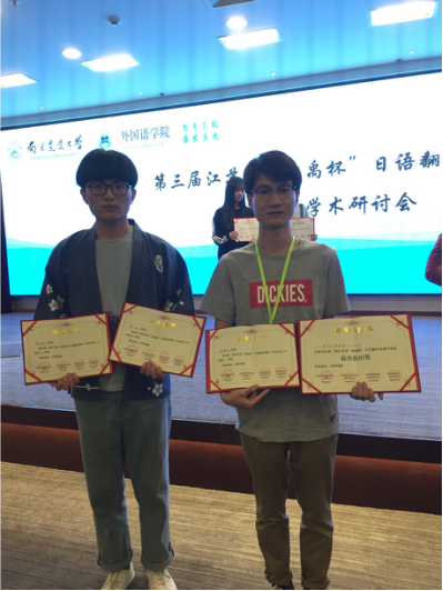 决赛中,我院学子展现出了高超的翻译水平,最终戴苗获得日译汉组特等奖,徐燕斌获得汉译日组二等奖,娄译伦获得汉译日组三等奖,且我校被评为此次大赛的最佳组织奖。此次大赛日译汉组设特等奖1名、一等奖3名、二等奖6名、三等奖10名,汉译日组一等奖2名、二等奖3名、三等奖5名。此次翻译大赛展现出了我院学子扎实的语言功底和翻译能力,得到了主办方以及全国高校的高度认可。