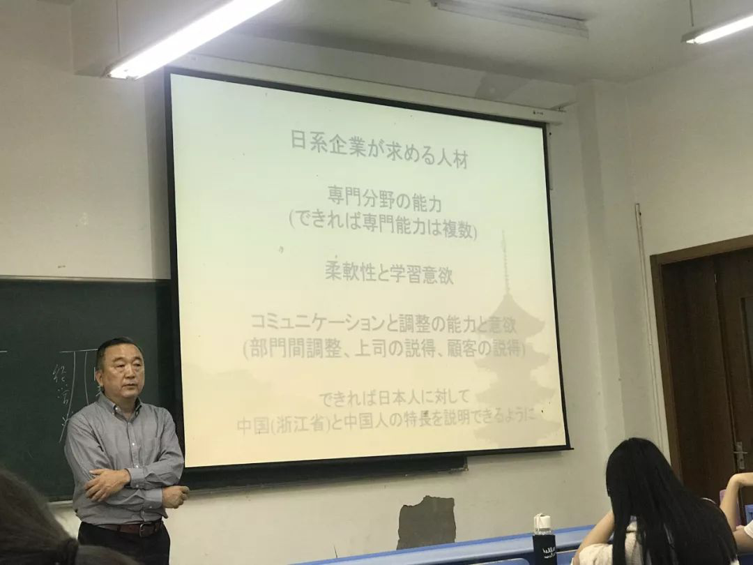 7月2日,学院实务导师、杭州圣世特物流邮箱公司及杭州尚昇文化有限公司董事长兼总经理、京都旅游观光大使余慧女士及嘉兴JFE精密钢管有限公司董事兼总经理青柳昌司先生,走进大二日语专业《就业指导与模拟面试》课堂,与学生们分享了他们的一些经验。