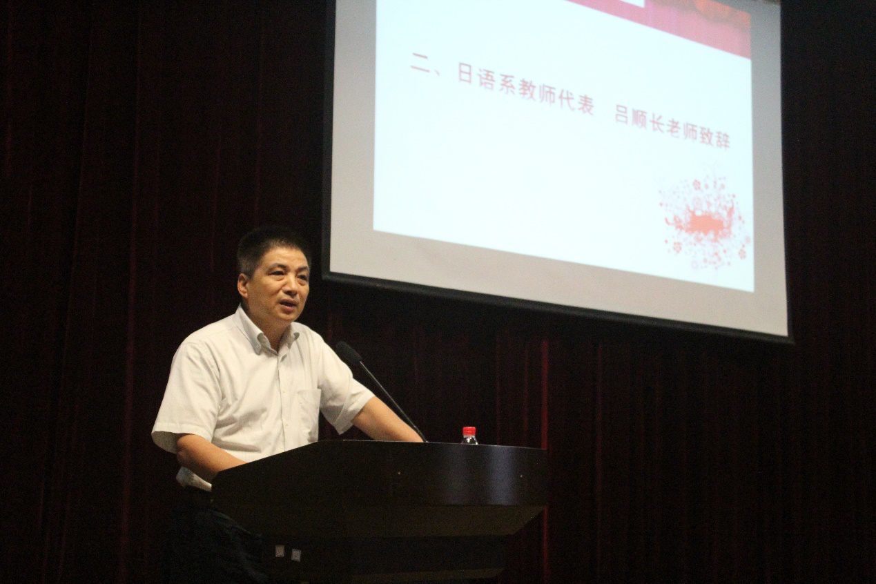 日语系教师代表吕顺长老师的致辞写了满满两页纸,他介绍了自己在日本执教的经历,并向大家介绍了日本大学生的生活,让同学们了解到了异国文化的精髓。