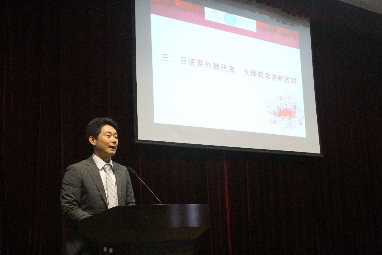 日语系外教代表久保辉幸老师致辞时标准的汉语发音,一上来就让同学们大吃一惊,他通过介绍自己学习汉语的经历,告诉同学们在学习语言过程中,打基础的第一年非常重要。