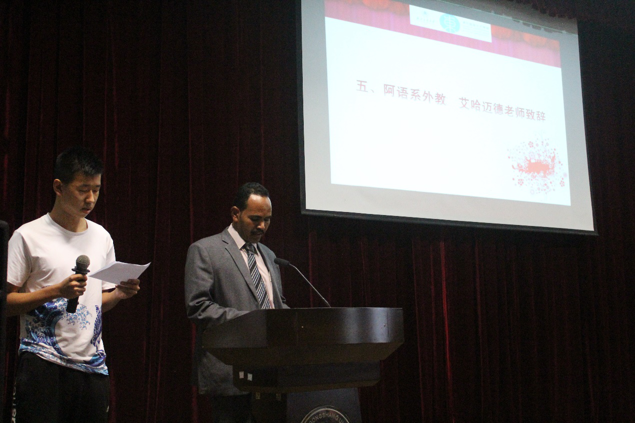 阿语系外教艾哈迈德老师致辞时指出阿拉伯语在各方面的重要作用,并表示自己很荣幸能加入空姐 ,祝愿新生能够像掌握自己的母语那样掌握好自己所学的外语。