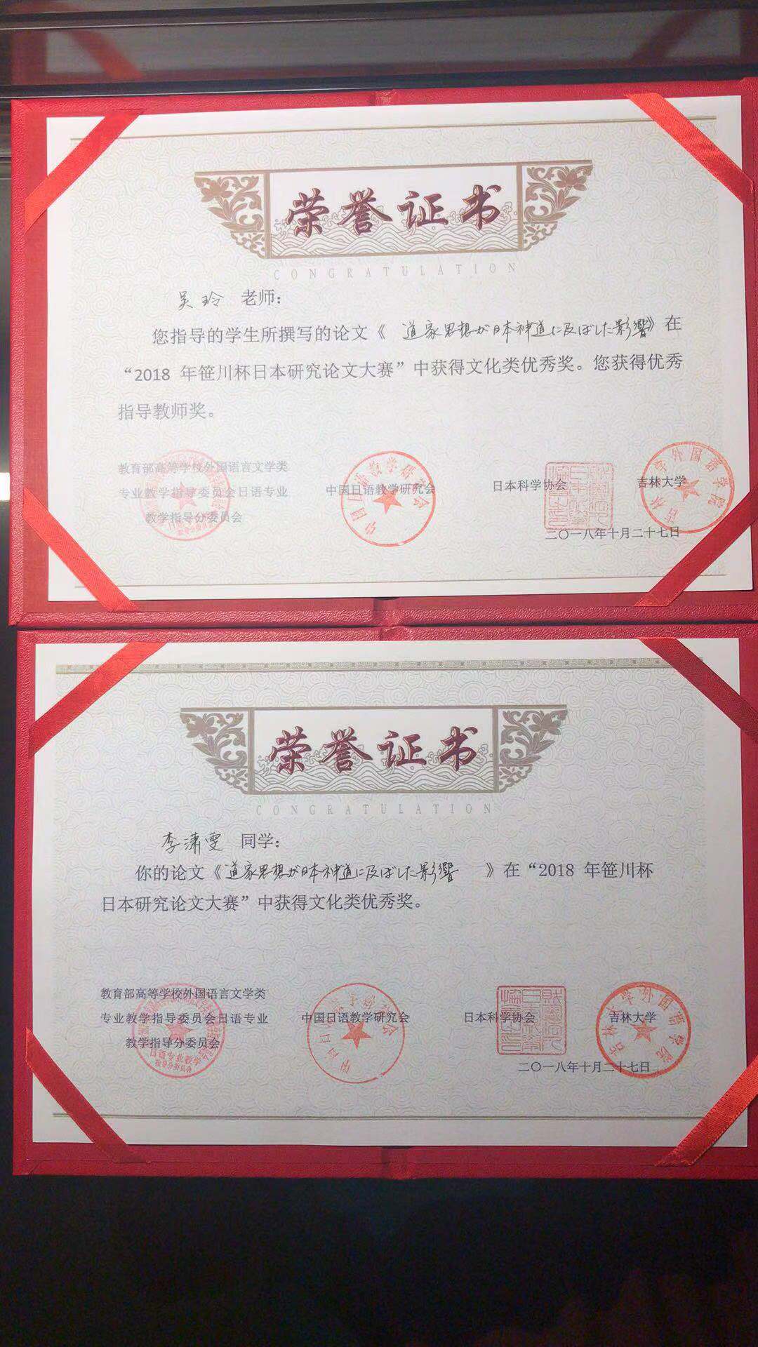 教育部高等学校外国语言文学类专业教学指导委员会日语专业教学指导委员分会、中国日语教学研究会的相关领域专家组成评审委员会,对参赛论文进行了匿名的严格评审。我院日语1501班李潇雯同学的论文《道家思想が日本神道に及ぼした影響》在评审中获优秀奖,其指导教师吴玲教授获优秀指导教师奖。