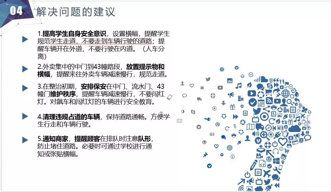 校园内网络信号问题也一直是师生都十分关注的方面,而移动网络基站信号覆盖存在问题,造成学校不同区域不同运营商的移动网络无法正常运作,一定程度上影响了教职工及学生正常的工作学习生活。针对这一现象,来自管理学院的3号提案团队进行了为期40天的调研、7次实地考察,通过对225份问卷进行数据分析和联系相关老师,提出增加信号基站以及信号加强器的数量,增大无线网络的覆盖面积和加大对数据网络以及无线网络的投资力度的解决方案。论安全,从校园照明死角到校园交通隐患