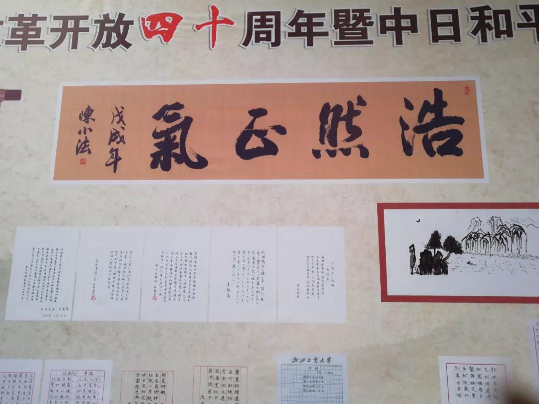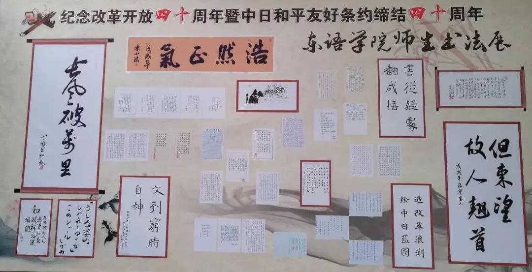 近日,为纪念改革开放四十周年暨中日友好和平条约缔结四十周年,在院领导和中外老师们的大力支持下,我院研会发动广大师生成功举办了此次专题书法展。作品征集通知下发后,空姐 师生踊跃参与,东亚研究院副院长陈小法老师欣然泼墨挥毫,外教久保辉幸老师、冈田重美老师也纷纷献上墨宝。我院本科生及研究生们也纷纷以毛笔或硬笔书写诗词歌赋、名言警句,内容丰富、各具风格,或苍劲有力,或秀美隽永。经过收集登记后,最终选定优秀作品五十余幅,制作成巨幅展板供大家欣赏。