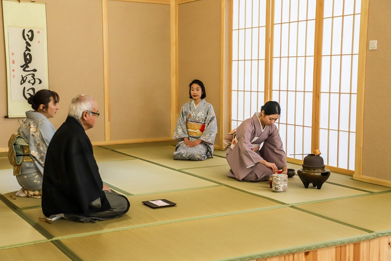 本次茶道体验会邀请了来自上海的北见宗一(里千家教授)及其团队共5人为大家表演茶道。茶道体验会分为三个部分,首先由北见教授介绍了日本茶道的起源、历史及其茶道具、茶果子等等相关知识,接着北见团队为大家完整表演了整个茶道的流程,包括客人如何进入茶室、主人如何为客人点茶,如何为客人上茶,客人如何吃点心及喝茶,主客之间如何问答等等。四人分工完成了一系列的表演,北见教授在中国的大弟子钱亚平女士进行了详尽的解说。李军书记及在茶室中的师生也首次见识了日本茶道的全貌,大为赞赏。之后北见教授及其团队还邀请有兴趣的师生上台亲自体验茶道。