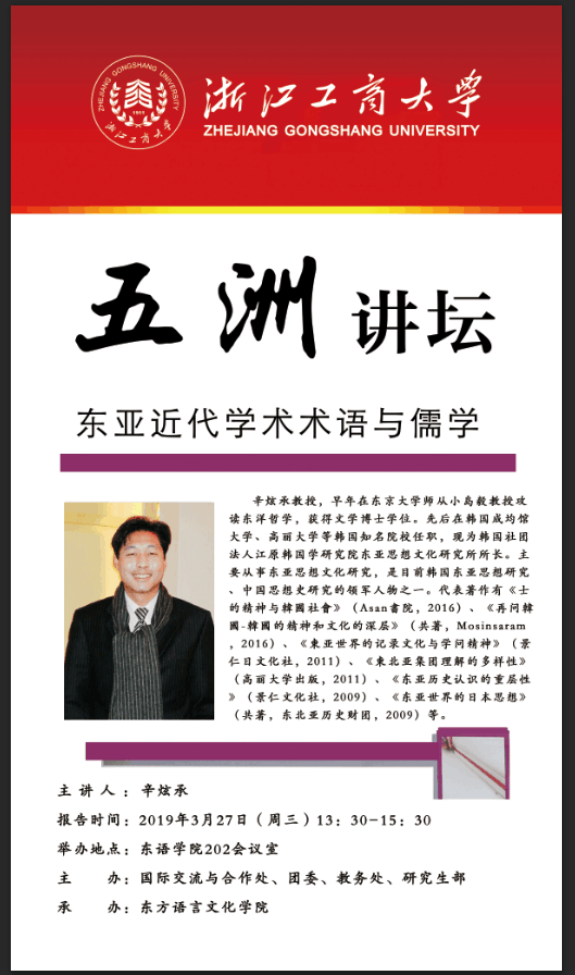 2019年3月27日下午,韩国社团法人江原韩国学研究院东亚思想文化研究所所长辛炫承教授莅临我院作题为《东亚近代学术术语与儒学——以西周的译语为中心》的学术讲座。