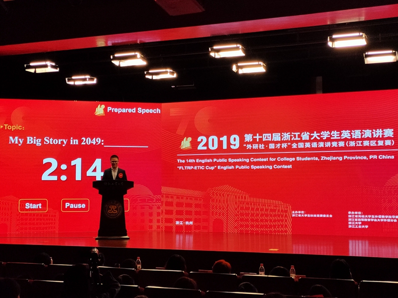 浙江省大学生英语演讲竞赛暨2019年“外研社·国才杯”全国英语演讲大赛浙江省竞赛分初赛和复赛,赛期两天。初赛为命题演讲,题目为“My Big Story in 2049”,来自省内55所高校的160名选手参与26日的初赛,最终选拔50%选手晋级27日的复赛。复赛形式为即兴演讲、外籍评委提问和常识问答三个环节。“外研社杯”全国英语演讲大赛是浙江省教育厅认可的A类学科竞赛,也是目前国内规模最大、知名度最高、水平最高的英语演讲赛事。(兰大伟老师撰文发布)