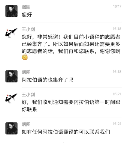 我院留学学生身处国外,看到家乡疫情严重,揪心的同时也期望能出一份力。学生团队成员之一蔡学庸说:“身在海外,如果能帮助祖国做点力所能及的事情,一定义不容辞,如果看到祖国的召唤,却保持沉默,那不是我们阿语人的秉性,我们自当冲锋在前。”他们时刻待命着。