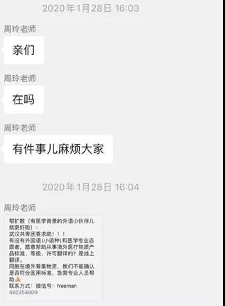 1月28日,阿语系主任周玲老师将武汉市共青团的号召转发在学生群中。