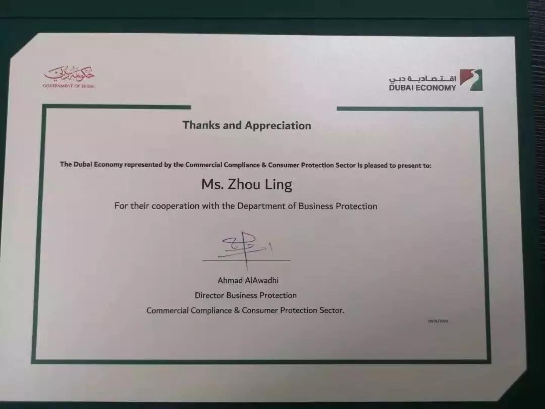 (周老师在迪拜经济局接受嘉奖)