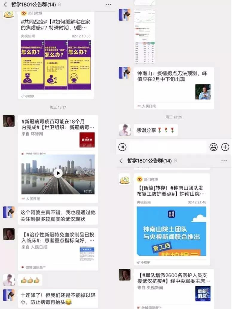 从1月6日国家疾控中心发文启动二级应急响应开始,有关此次肺炎的新闻和谣言开始齐飞。造谣一张嘴,辟谣跑断腿。互联网时代谣言的流传速度和广度极其迅猛,作为高校学子和团员青年,我们能做的无疑是帮助大家在鱼龙混杂的信息中甄别谣言,强化疫情时期信息的时效性与准确性。同学们每日坚持分享科学准确的新闻,令沉寂的班群再度活跃起来。