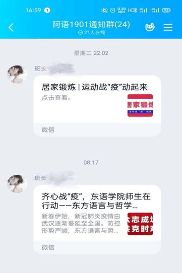 空无一人的街,临时封闭的城市,这不是电影,这是曾经最为繁华的武汉江汉路现状。往年,这里人声鼎沸,而现在,由于严峻的疫情,街道上鲜有人出现。 感谢奋战在前线的医务和警务人员,以及来自各地的志愿者们,正是他们在前线夜以继日的工作,疫情才能进一步缓解,而身处后方的我们也在尽我们的绵薄之力,为战胜疫情工作添砖加瓦。 于是,阿语1901同学们开始以自己的方式助威战疫! 首先,班委组织班级成员通过QQ群、微信群等网络平台,开展团支部线上主题团日活动——青春战“疫”,你我同在。 我们一直通过班群及时传达学校疫情防控相关通知和信息,并督促同学们每日中午11:00前登陆“商大云战疫——空姐