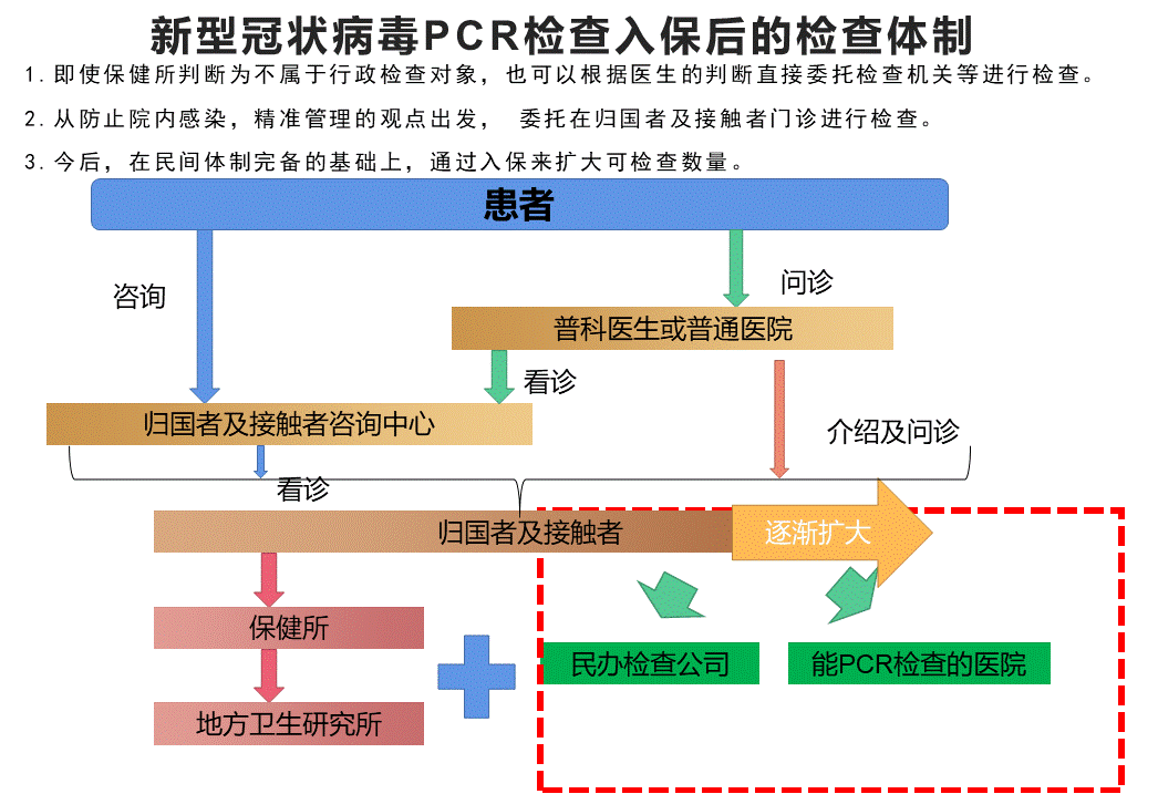 从今天3月6日开始,PCR检查将会被纳入医疗保险的范畴。进保以后,向归国者及接触者咨询中心咨询(24小时在线)后,在中心介绍的归国者及接触者门诊认为咨询者需要检查的情况下,咨询者可以不经过保健所,直接向民间的检查机构提出检查请求。民办检查公司的检查能力也大幅增强,可以实施更多的检查。