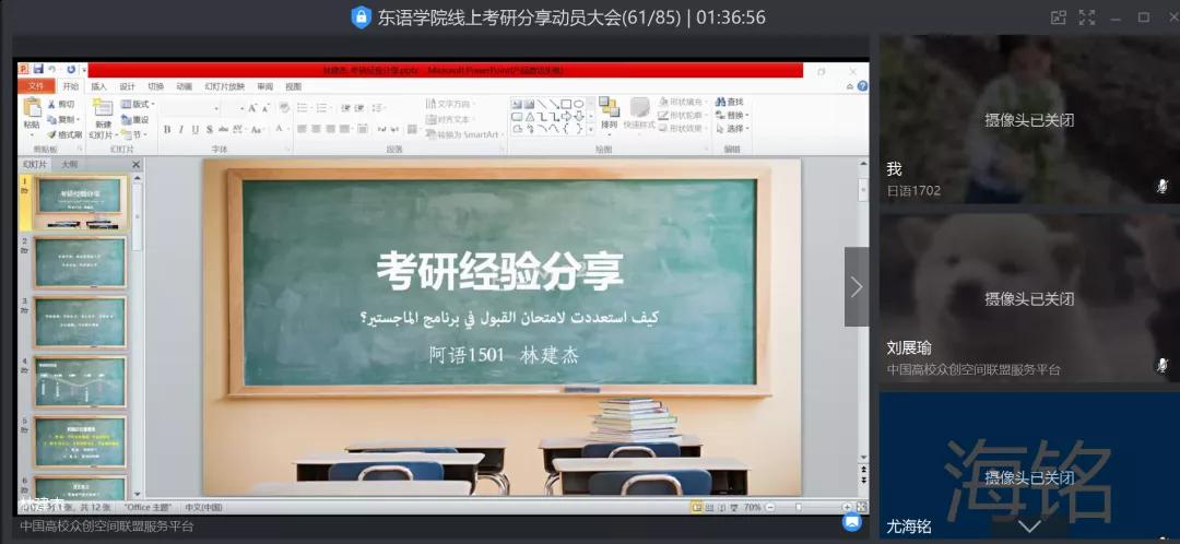 为进一步推动我院学风建设,激发大三学生考研深造积极性,为同学们提供有效的考研经验指导,5月22日下午,学院举行17级学生考研动员暨考研经验分享视频会议。学院党委书记周宏力老师参加并讲话,学生工作办公室主任兰大伟、团委书记杨月燕、辅导员沈霄鹏等老师及我院部分在国内外高校读研深造的毕业生校友参与大会。会议由杨月燕老师主持。
