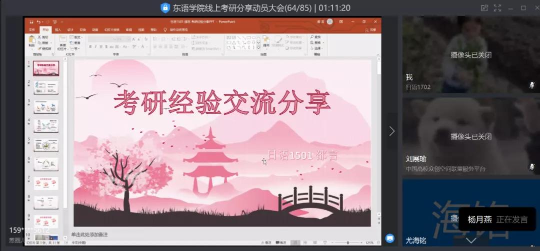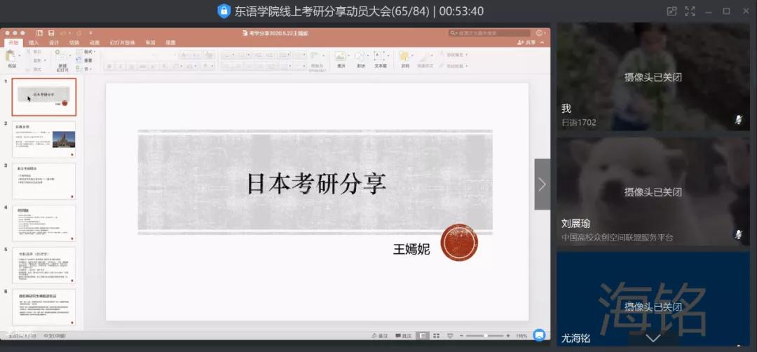 紧接着,日语1401班毕业生、目前在日本东京大学攻读经营学硕士的王嫣妮校友就赴日考研经历分享了她的丰富经验。王嫣妮曾同时被东京大学、大阪大学和神户大学录取。她以自身考研经营学的时间线为轴,从日本考研经营学的概况出发,就择校、赴日考研准备等方面提出许多宝贵建议,并提醒同学们应在明确目标后坚定决心,一鼓作气,切勿拉长战线,浪费太多时间精力。