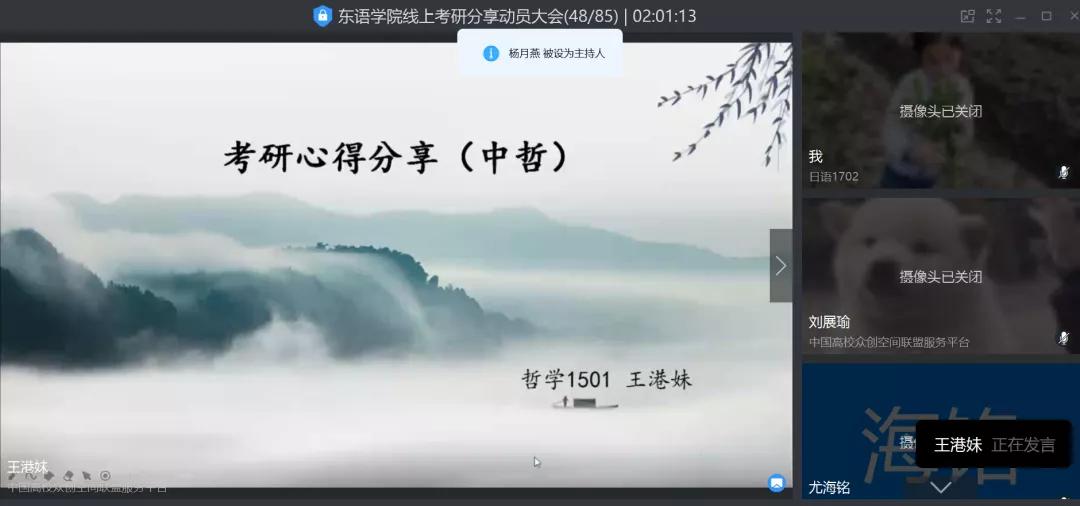 最后,哲学1501班毕业生、现南京大学中国哲学专业研究生王港妹校友分享了她的考研心得与体会。王港妹建议,应综合学校本身、地理位置和报录比等因素后进行择校。而在备考方面,王港妹细致分享了专业信息查询、考研资料搜罗、各科目具体复习等方面的实用技巧,希望同学们在考研过程中能保持乐观心态,坚持不懈,高效备考,并祝愿同学们能在考研中如愿考上心仪的学校专业,实现自己的梦想。