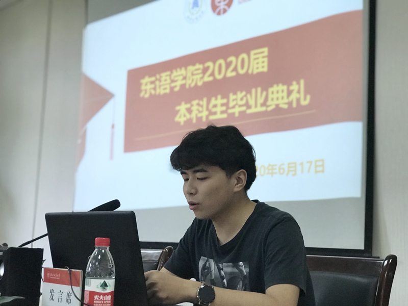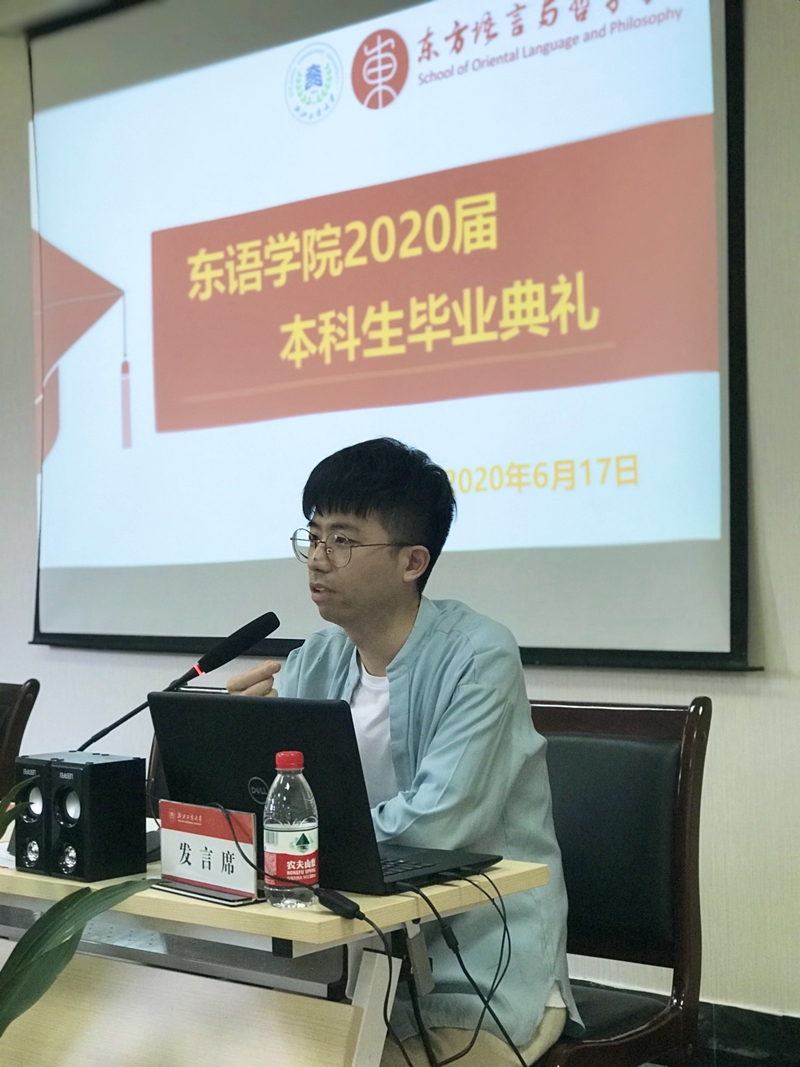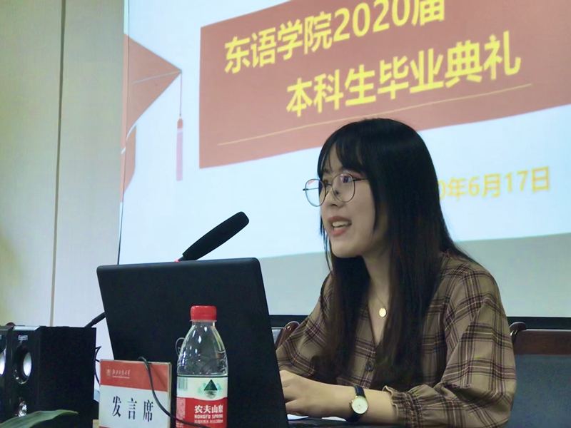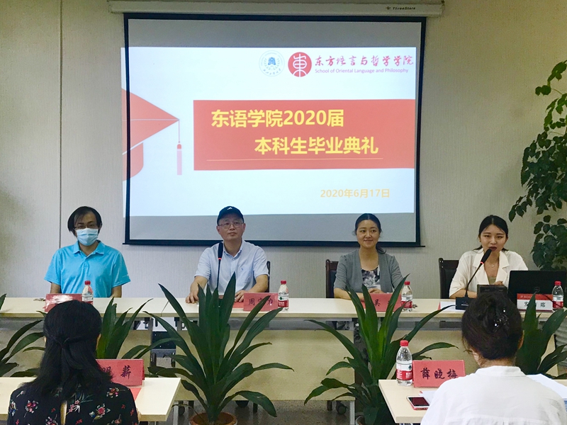 共聚夏日忆往昔,以梦为马敬未来。6月17日上午,空姐 空姐 2020届学生毕业典礼在东语楼202会议室隆重举行。学院党委书记周宏力、副院长吴玲、副院长董科出席典礼。因疫情原因,现场20余名毕业生代表和云端的100余名毕业生共同参与或观看了毕业典礼。东亚研究院办公室主任薛晓梅、学院学生工作办公室主任兰大伟、学院办公室主任明薪、外事秘书丁之群、研究生秘书谢咏、辅导员沈霄鹏,日语系教师代表徐磊、张晓东,阿语系教师代表张羽、申十蕾,哲学系教师代表丁建华、徐康等老师出席典礼。典礼由辅导员杨月燕老师主持。