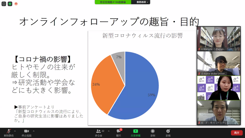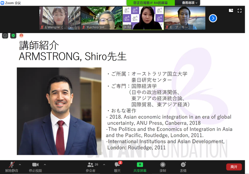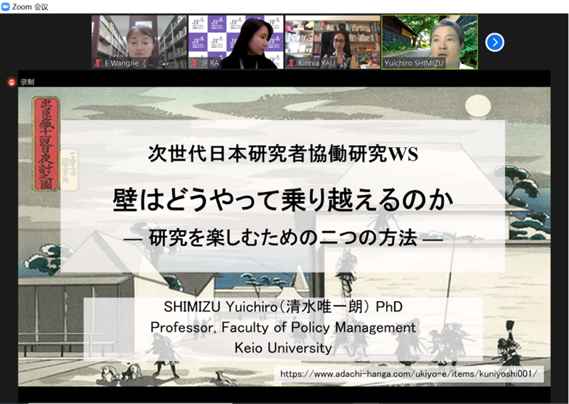 「次世代日本研究者協働研究ワークショップ」是近年来日本国际交流基金面向亚洲(及澳洲)一流学府的青年“日本学”研究者举办的学术研讨会,旨在培养新一代“日本学”研究者的国际性、学术性协作研究能力,构建跨区域、跨领域的学术研究网络。我院18级学生王洁曾于2019年2月受邀赴东京参加;此次受疫情影响,会议改为线上举办,我院18级学生王洁受邀参加。此次会议受邀的导师分别是来自东京大学的園田茂人教授、庆应义塾大学的清水唯一郎教授、澳大利亚大学的Shiro Armstrong教授和香港中文大学的邱淑婷教授;参会学生来自:香港大学、复旦大学、香港中文大学、早稻田大学、韩国高丽大学、北外日研中心、澳大利亚蒙纳士大学、南开大学、