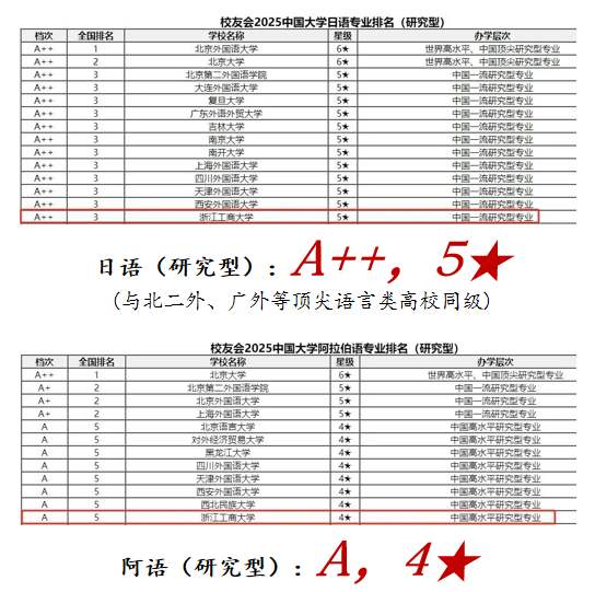 在2025校友会中国大学研究型专业排名中,我院日语专业位居全国第三(A++,五星级),阿拉伯语专业位列全国第五(A,四星级)。